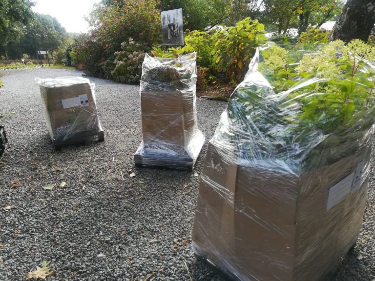 Les hortensias sont conditionnés sur palettes et protégés pour le transport à l’aide de cartons et de paille.
