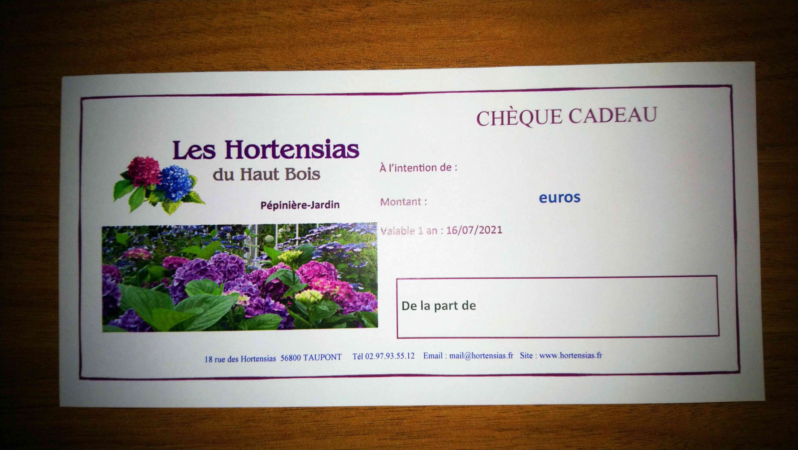 Lorsque vous allez commander sur notre site il faudra choisir le montant souhaité (30€, 50€, 75€, 100€, 150€, 200€, 500€ ou 1000€). Bien renseigner les coordonnées du destinataire qui recevra par courrier le chèque cadeau. Je vous invite à nous faire part du message que vous souhaitez voir apparaître sur le chèque dans la rubrique commentaire. J’accompagne toujours la carte cadeau avec une belle carte postale de la pépinière et avec la différente documentation de la pépinière. Le bénéficiaire aura 1 an pour faire valoir son bon cadeau (numéro unique) à la pépinière, sur un salon ou bien par téléphone pour passer commande en vente par correspondance.