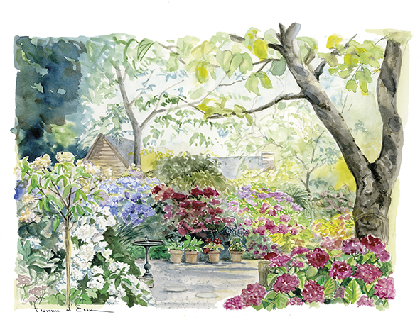 Reproduction d’aquarelle de Florence d’Ersu de différentes variétés d’hydrangea de la pépinière